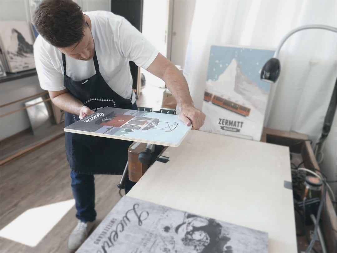 The most recent range of locally Swiss made products is the “ Tour De Suisse “. He identified icons of Switzerland and re-positioned them in various design styles celebrating these sites in a more nostalgic way. Currently the ‘Tour de Suisse’ Range has a collection of 40 different Sujets in the form of: Prints on wood, aluminium,, Plexi glass, Cards and Notebooks, watch out for the yearly calendar.