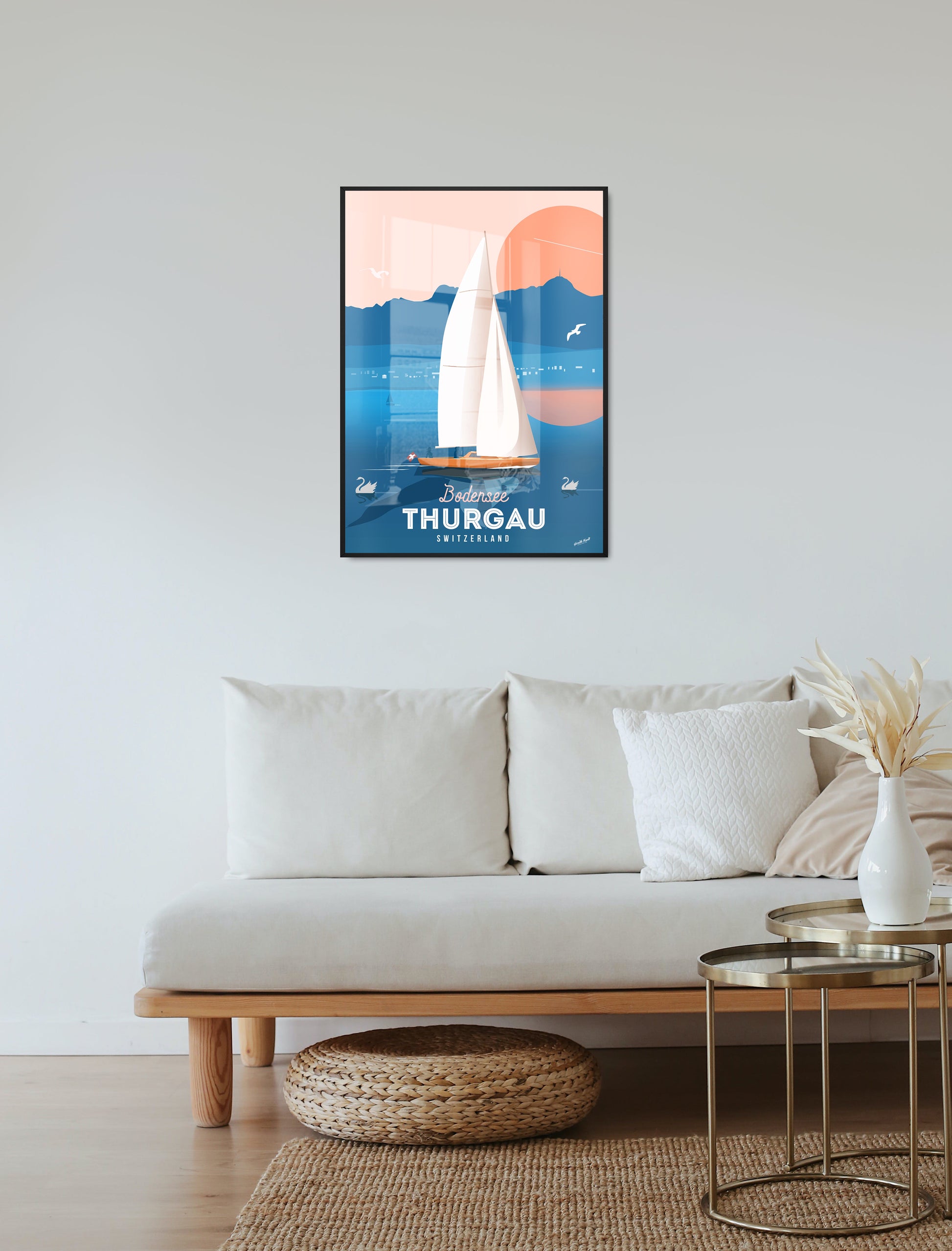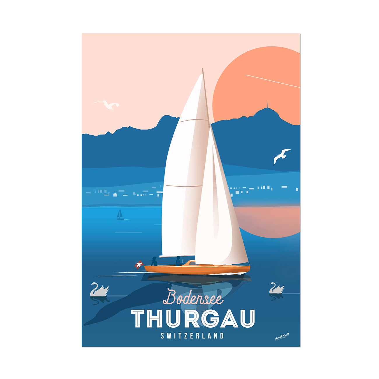 Sailing on Lake Konstanz with the Säntis in the background with sun setting.