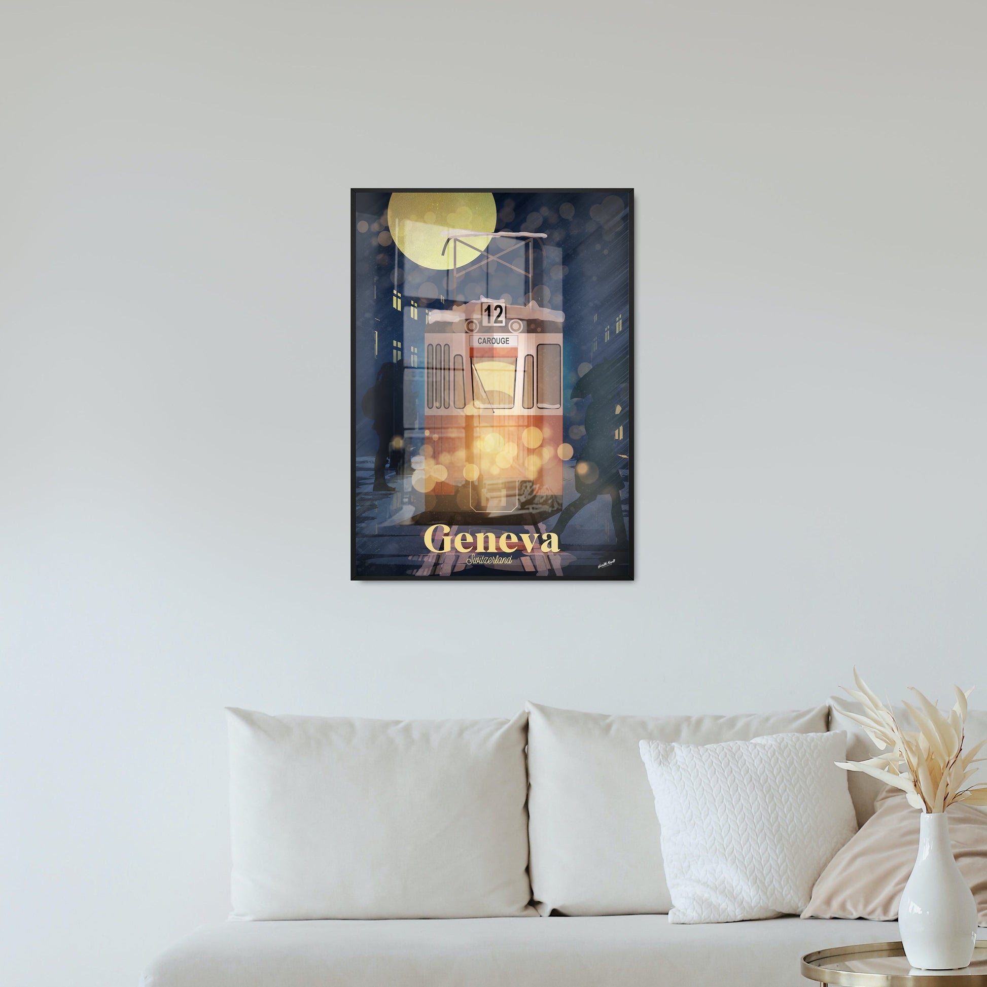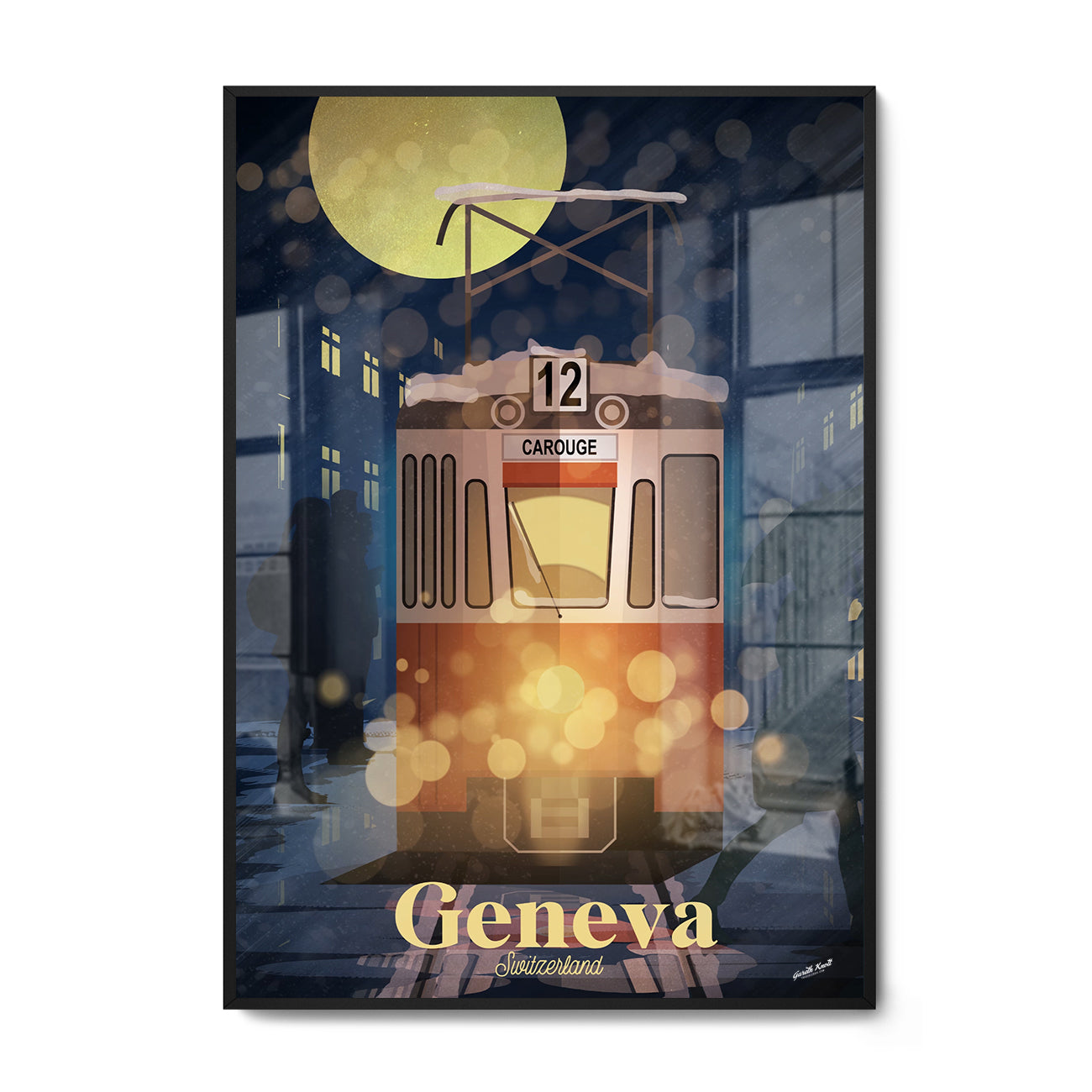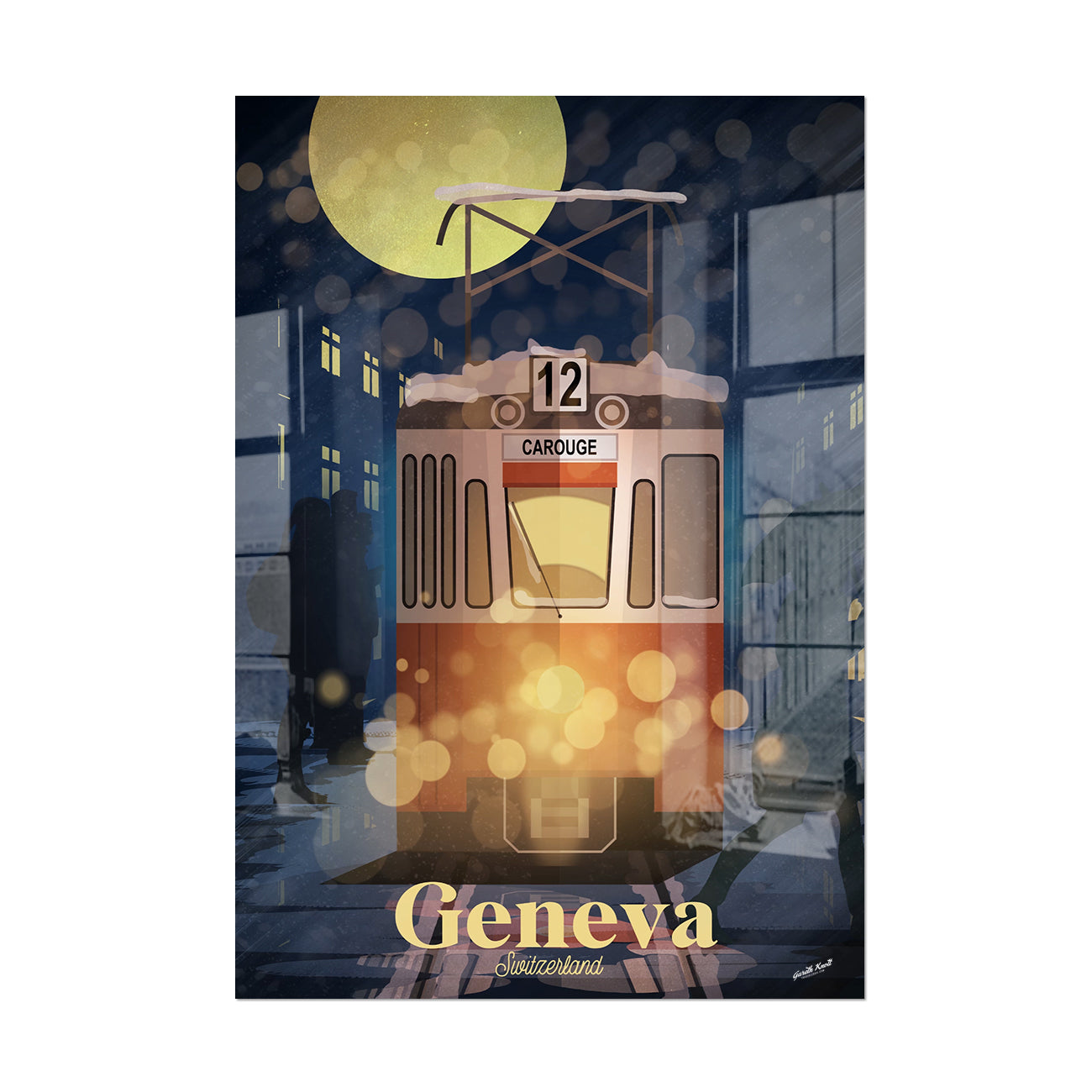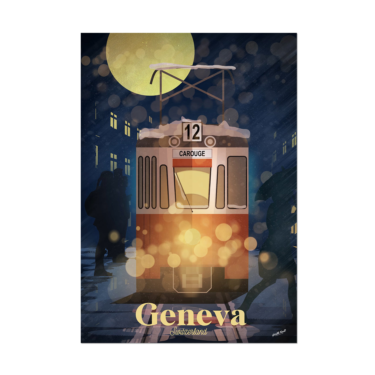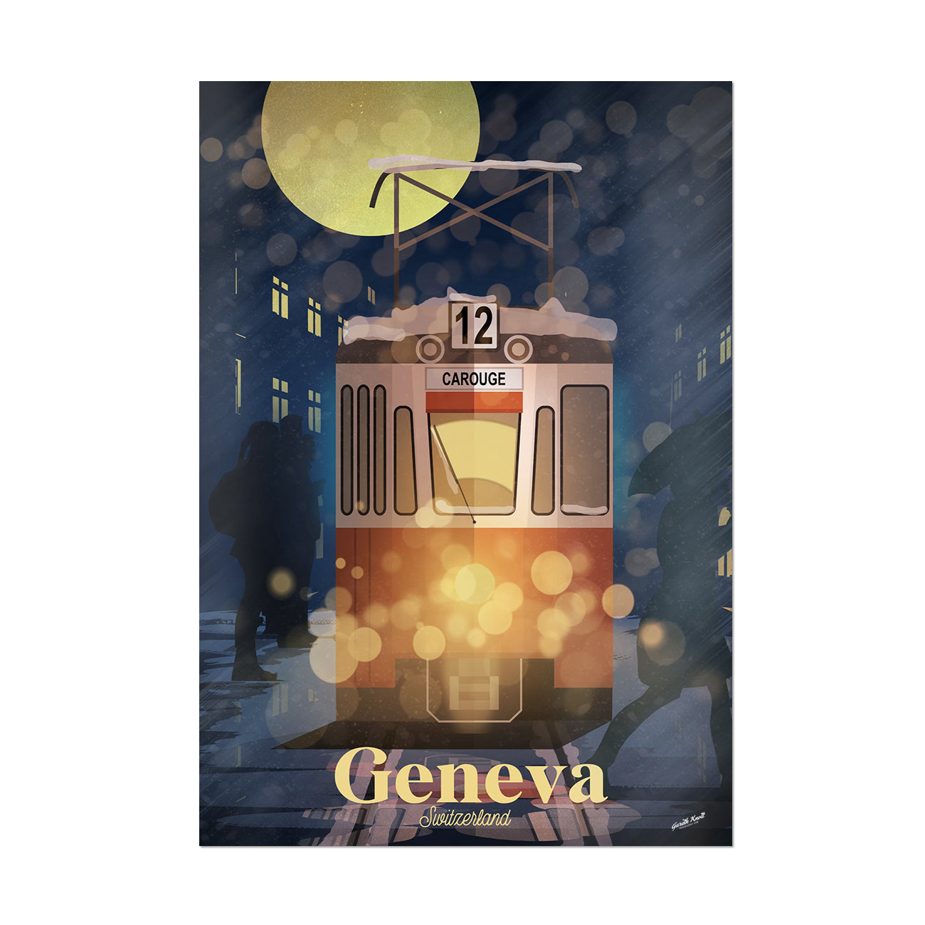 The Tram 12 Carouge makes its way through the snowy streets of Geneva.