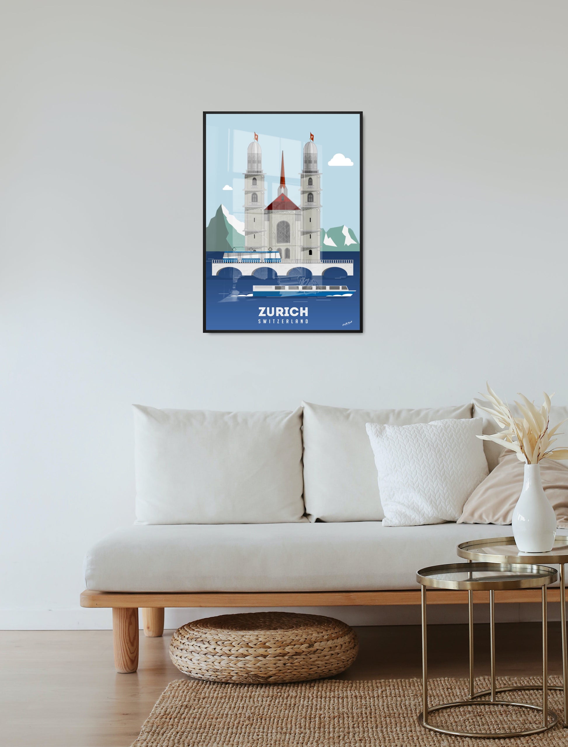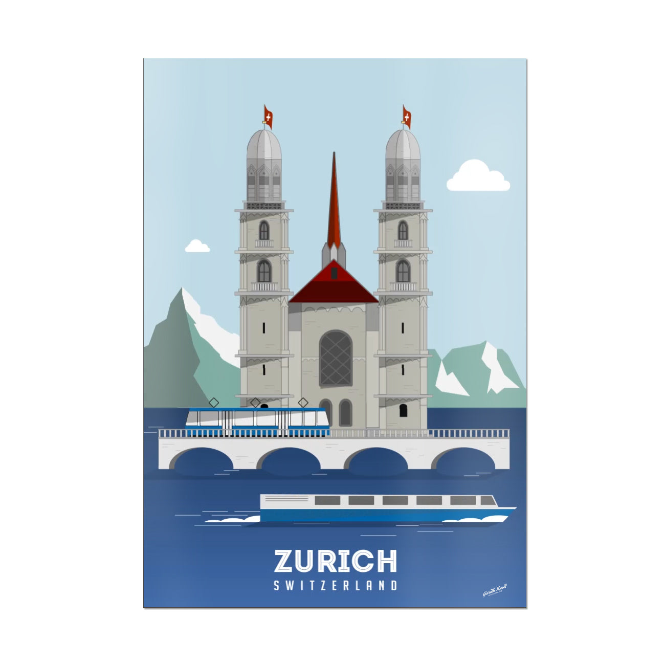 The Grossmunster church is the ever presence watchful eye over zurich. This collage shows Zurichs most beautiful man made feature and natural feature in harmony with each other , with the constant backdrop of the distance mountains.