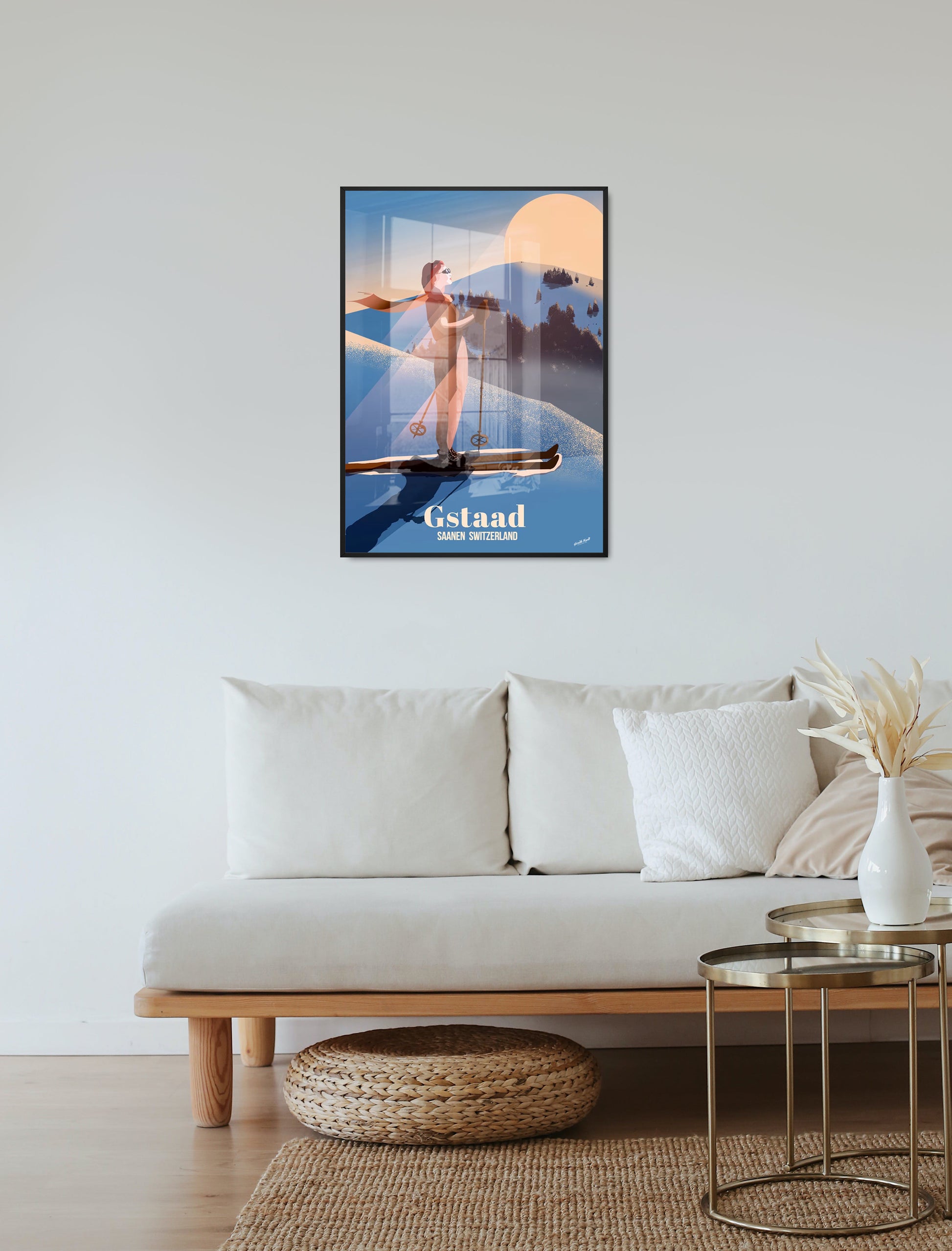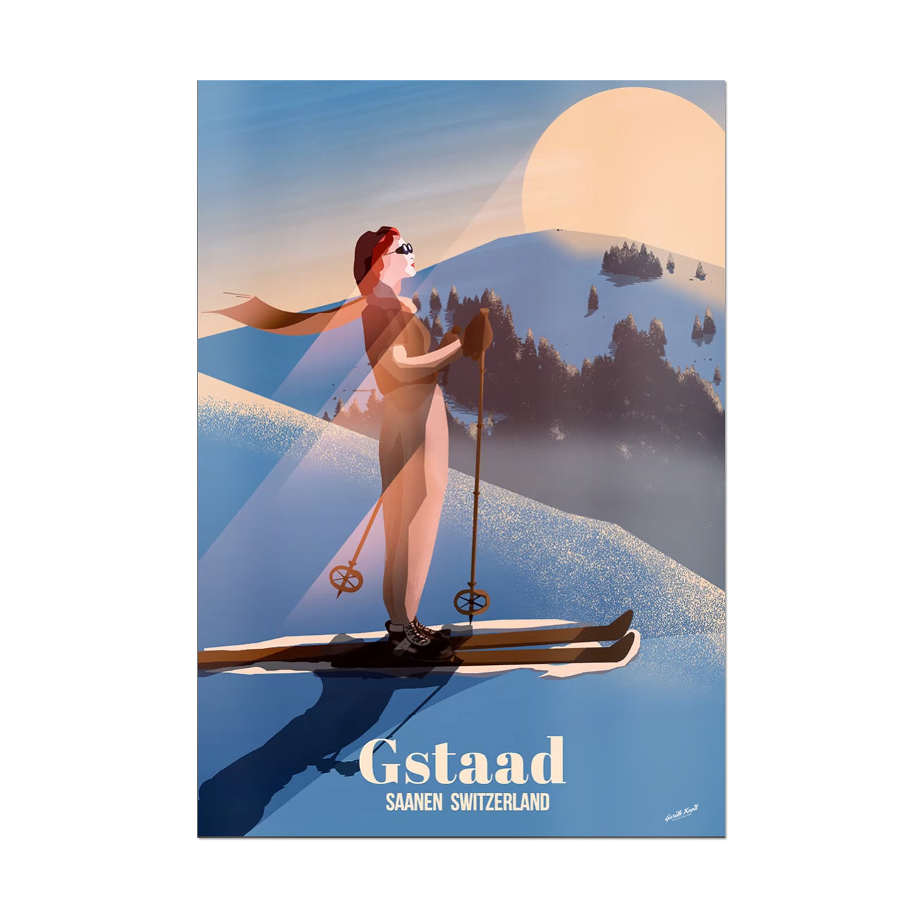 A nostalgic illustration of a Lady poised over the Gstaad valley.