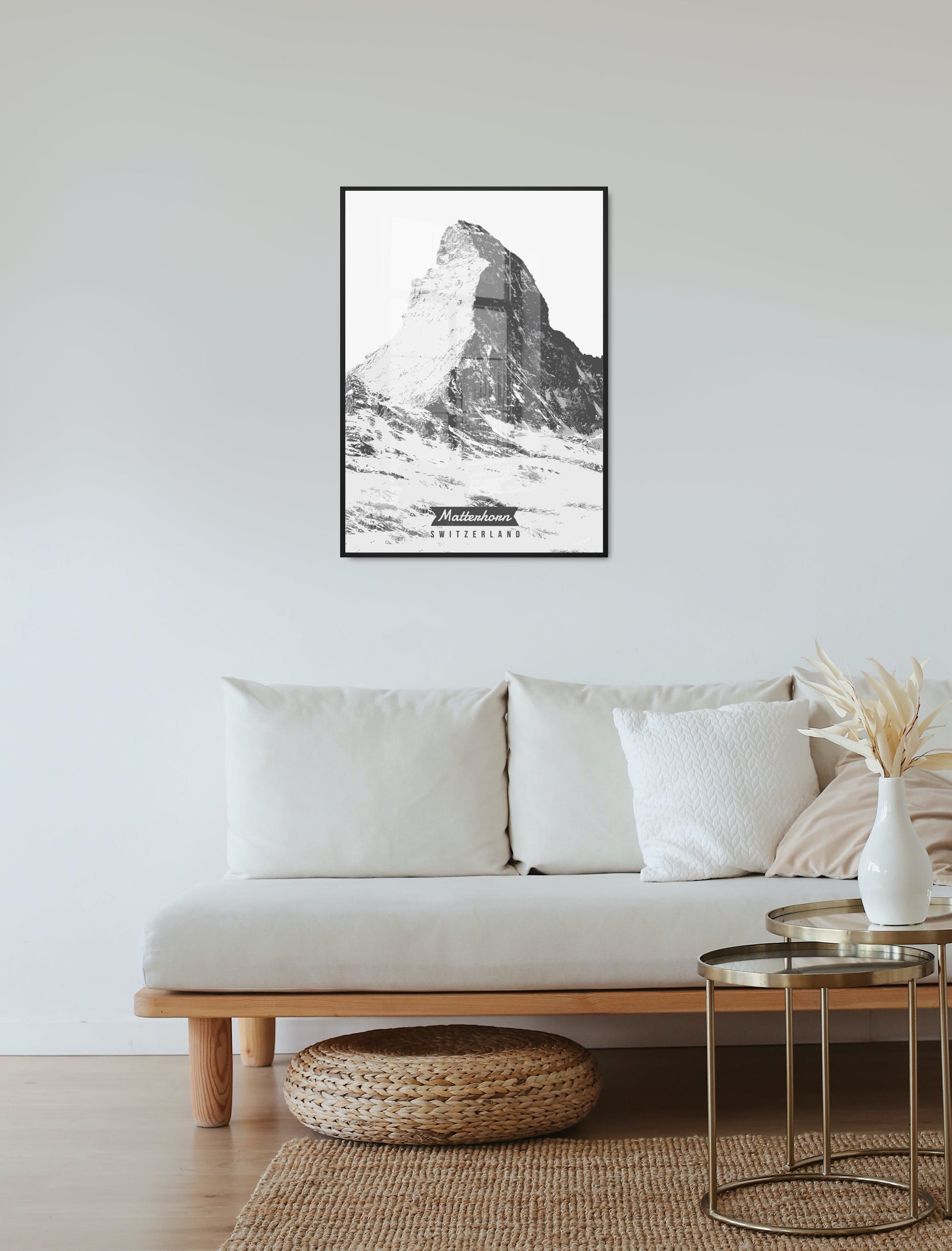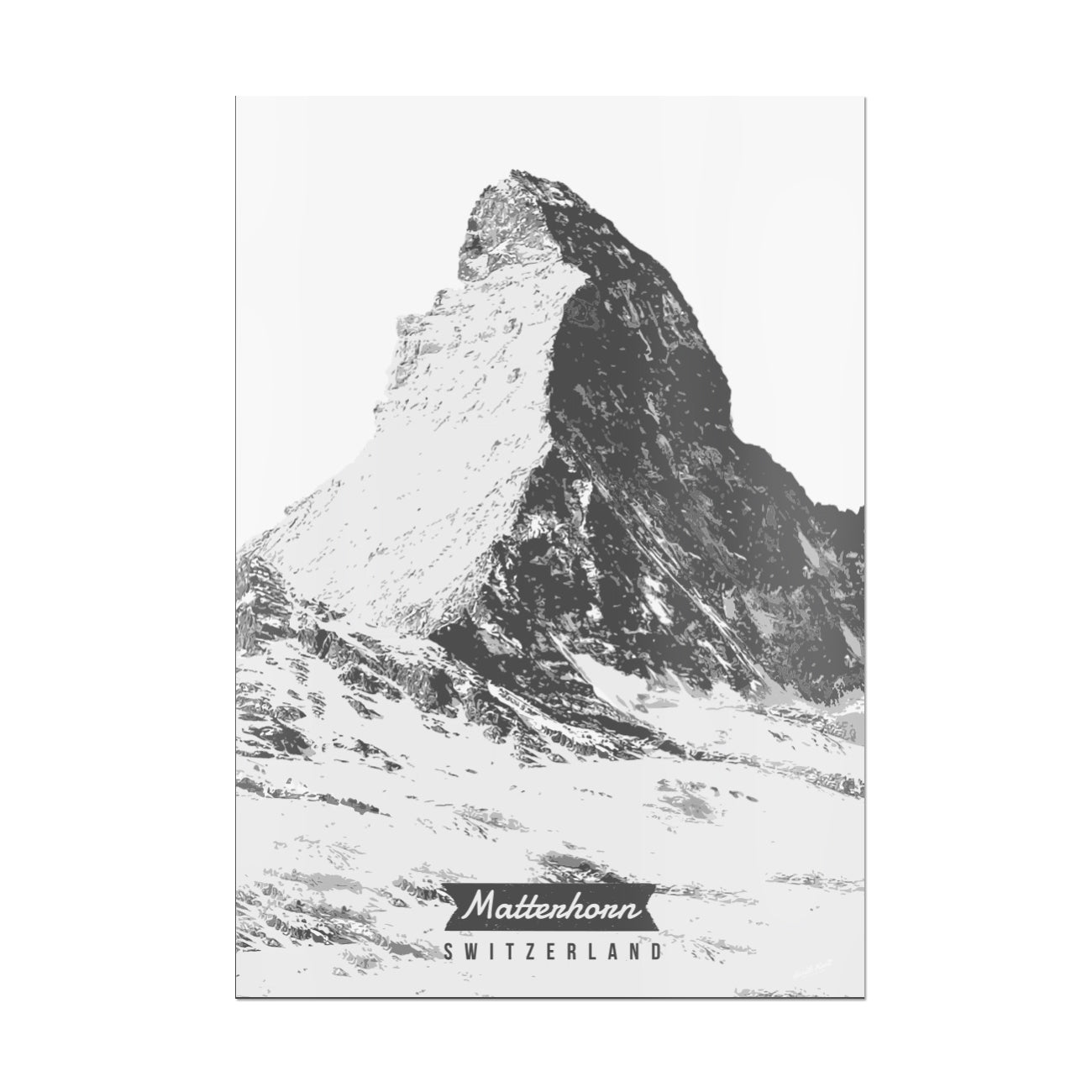 One of the most iconic mountain peaks in the world, the Great Matterhorn Mountain. Stands tall and upright between its neighbouring slopes. This is a world-renowned icon that in black and white vectorised styling gives it a classic timeless look.