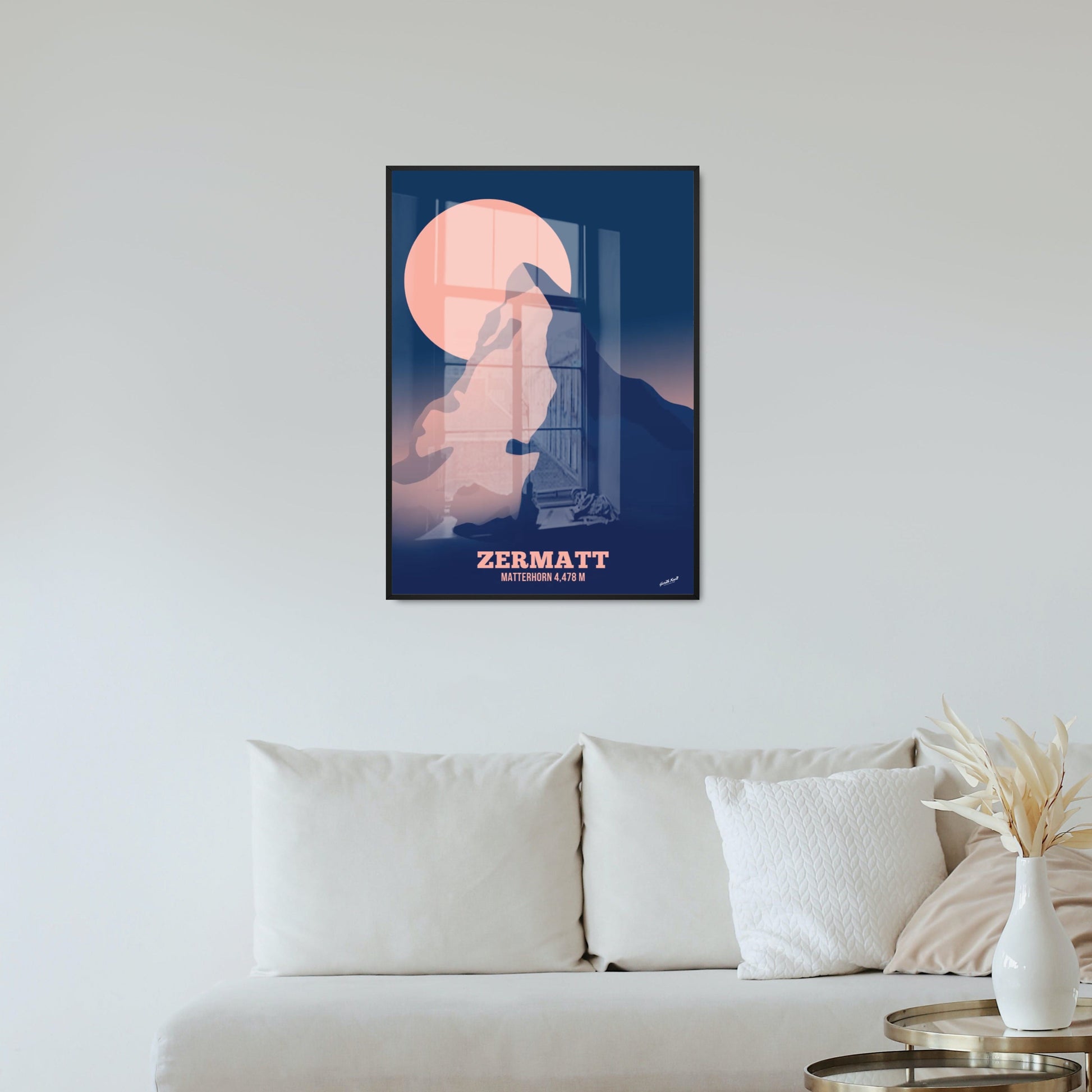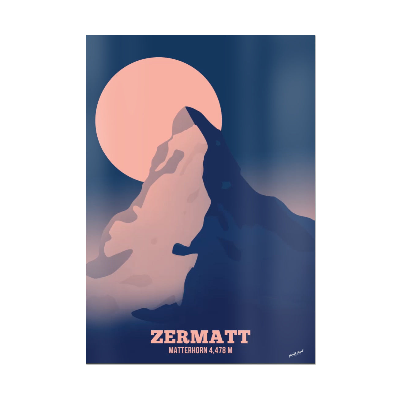One of the most iconic mountain peaks in the world, the Great Matterhorn Mountain. Stands tall and upright between its neighboring slopes. this is a representation of a twilight scene celebrating the diverse colours of the skies.